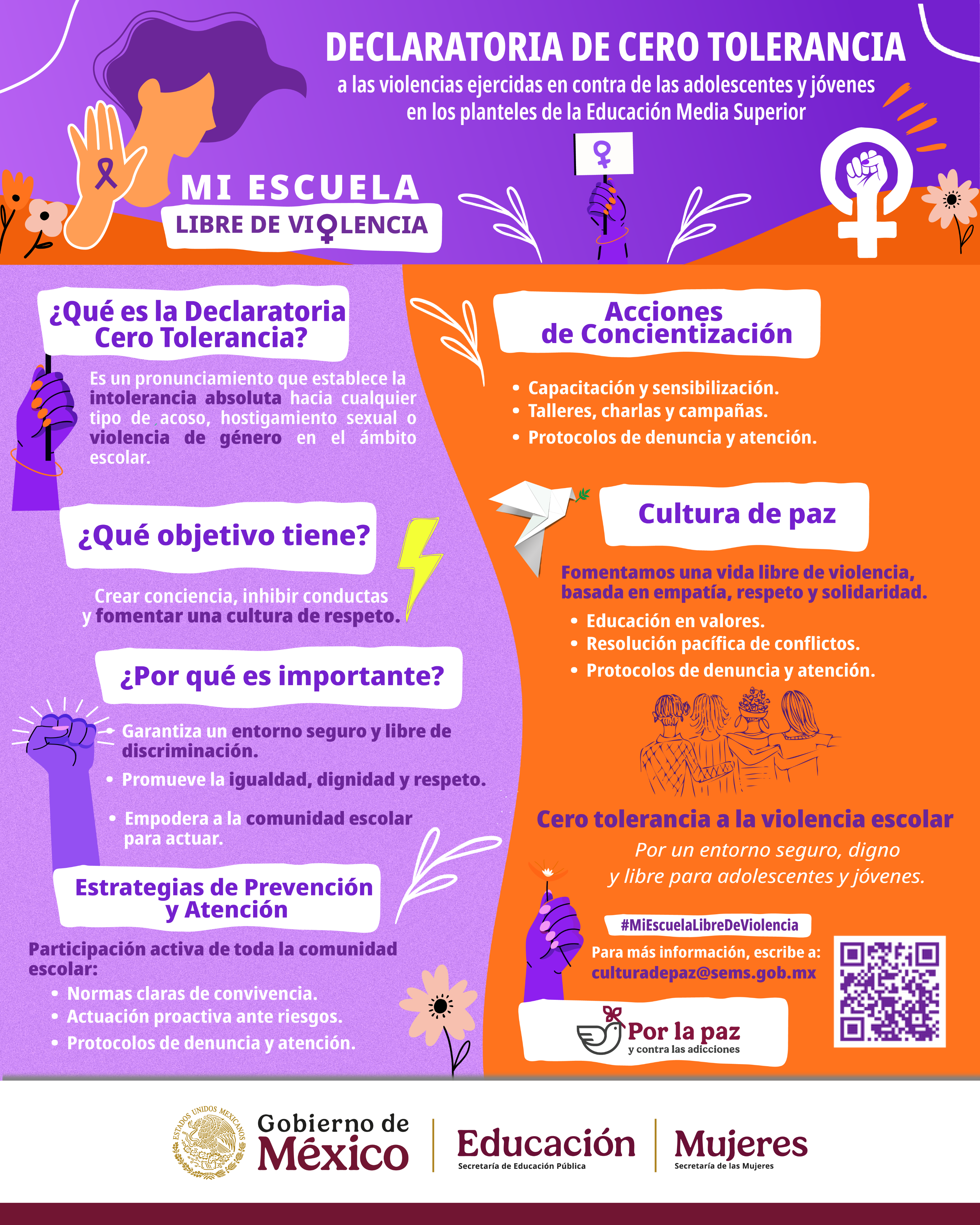 Con esta declaratoria reafirmamos nuestro compromiso con la CERO TOLERANCIA a las violencias ejercidas en contra de las adolescentes y jóvenes en los planteles de la Educación Media Superior. Te invitamos a conocer el documento completo y a consultar el material de apoyo que hemos preparado para su difusión.